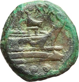 Roman Republican. 'Rostrum tridens' series. Quadrans, ca 206-195. Obv.: Head of Hercules right; behind three pellets. Rev.: Prow right; above ROMA-rostrum tridens. Below three pellets. Syd. 245c. Cr. 114/5. AE. g. 7.64 mm. 20.00 R. VF. Repubblica Romana. Serie 'rostrum tridens'. Quadrante, ca 206-195. D/ Testa di Ercole a destra; dietro tre globetti. R/ Prua a destra; sopra ROMA-rostrum tridens. Sotto tre globetti. Syd. 245c. Cr. 114/5. AE. g. 7.64 mm. 20.00 R. BB.