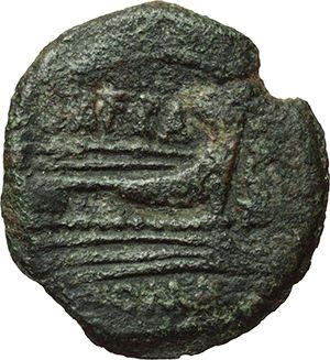 Roman Republican. S. Afranius. As, ca 150. Obv.: Laureate head of Janus; above mark of value I. Rev.: Prow right; above SAFRA and before dolphin. Below ROMA. B. Afrania 2. Syd. 389. Cr. 206/2. AE. g. 23.20 mm. 33.00 F/About VF. Repubblica Romana. S. Afranius. Asse, ca 150. D/ Testa di Giano laureata, sopra segno di valore I. R/ Prua a destra; sopra SAFRA, davanti delfino. Sotto, ROMA. B. Afrania 2. Syd. 389. Cr. 206/2. AE. g. 23.20 mm. 33.00 MB/qBB.