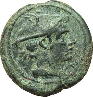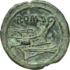 Roman Republican. Semilibral standard. Semuncia, 217-215 BC. Obv.: Head of Mercury right. Rev.: Prow right. ROMA above. Cr. 38/7. AE. g. 5.12 mm. 18.50 About EF/EF. A very attractive coin. Green patina. Repubblica Romana. Serie semilibrale. Semuncia, 217-215 a.C. D/ Testa di Mercurio a destra. R/ Prua a destra. Sopra, ROMA. Cr. 38/7. AE. g. 5.12 mm. 18.50 qSPL/SPL. Molto attraente. Patina verde.