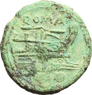 Roman Republican. Sextans, ca 215-212. Obv.: Head of Mercury right, above two pellets. Rev.: Prow right, above ROMA. Below, two pellets. Syd. 107. Cr. 41/9. AE. g. 7.79 mm. 23.50 Good VF. Lovely light green patina. Repubblica Romana. Sestante, ca 215-212. D/ Testa di Mercurio a destra, sopra due globetti. R/ Prua di nave a destra; sopra, ROMA. Sotto, due globetti. Syd. 107. Cr. 41/9. AE. g. 7.79 mm. 23.50 BB+. Bella patina verde.