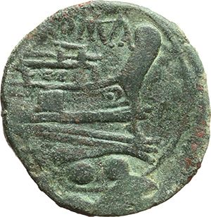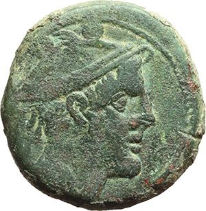 Roman Republican. Sextans, ca 215-212. Obv.: Head of Mercury right; above two pellets. Rev.: Prow right, above ROMA. Below, two pellets. Syd. 107. Cr. 41/9. AE. g. 12.60 mm. 25.50 About VF. Repubblica Romana. Sestante, ca 215-212. D/ Testa di Mercurio a destra; sopra due globetti. R/ Prua a destra; sopra ROMA. Sotto, due globetti. Syd. 107. Cr. 41/9. AE. g. 12.60 mm. 25.50 qBB.