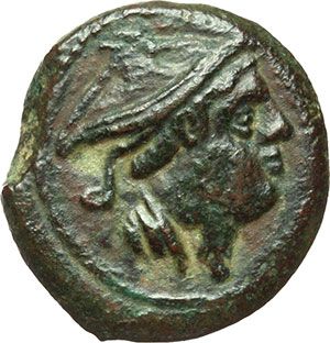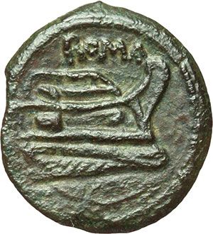 Roman Republican. Sextantal standard. Semuncia, after 211 BC. Obv.: Head of Mercury right. Rev.: Prow right. ROMA above. Cr. 56/8. AE. g. 2.59 mm. 14.50 About EF. Repubblica Romana. Serie sestantale. Semuncia, dopo il 211 a.C. D/ Testa di Mercurio a destra. R/ Prua a destra. Sopra, ROMA. Cr. 56/8. AE. g. 2.59 mm. 14.50 qSPL.