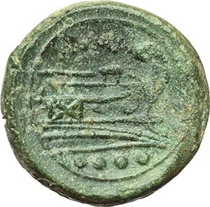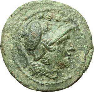 Roman Republican. Sextantal standard. Triens, after 211 BC. Obv.: Head of Minerva right. Four pellets above. Rev.: Prow right. ROMA above. Four pellets below. Cr. 56/4. AE. g. 14.54 mm. 27.00 EF. Repubblica Romana. Serie sestantale. Triente, dopo il 211 a.C. D/ Testa di Minerva a destra. Sopra, quattro globetti. R/ Prua a destra. Sopra, ROMA. Sotto, quattro globetti. Cr. 56/4. AE. g. 14.54 mm. 27.00 SPL. Raro di questa qualità.