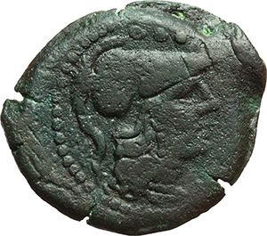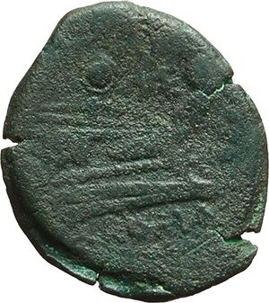 Roman Republican. 'Shield and MAE' series. Triens, ca 189-180. Obv.: Helmeted head of Minerva right; above, four pellets. Rev.: Prow right; above, shield and MAE ligate. Before, three pellets and below, ROMA. B. Maenia 4. Syd. 375b. Cr. 143/3. AE. g. 9.50 mm. 26.00 RR. About VF. Repubblica Romana. Serie 'Scudo e MAE'. Triente, ca 189-180. D/ Testa elmata di Minerva a destra; sopra quattro globetti. R/ Prua a destra; sopra scudo e MAE, davanti tre globetti. Sotto, ROMA. B. Maenia 4. Syd. 375b. Cr. 143/3. AE. g. 9.50 mm. 26.00 RR. qBB.