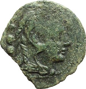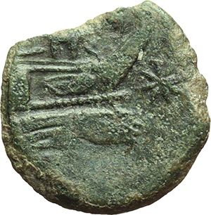 Roman Republican. 'Star' series. Quadrans, ca 206-195. Obv.: Helmeted head of Minerva right; above, four pellets. Rev.: Prow right; above, ROMA. Before, eight-rayed star. Below, ROMA. Syd. 264b. Cr. 196/4. AE. g. 3.49 mm. 18.50 R. About VF. Area of weakness on obv. Repubblica Romana. Serie 'stella'. Quadrante, ca 206-195. D/ Testa elmata di Minerva a destra; sopra quattro globetti. R/ Prua a destra; sopra ROMA, davanti stella ad 8 raggi. Sotto, ROMA. Syd. 264b. Cr. 196/4. AE. g. 3.49 mm. 18.50 R. qBB. Area di debolezza al D/.