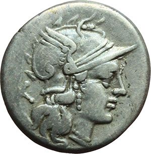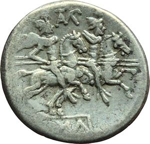 Roman Republican. 'TAMP' series. Denarius, ca 194-190. Obv.: Helmeted head of Roma right; behind X. Rev.: The Dioscuri galloping right; above horses TAMP and below, ROMA. B. Baebia 1. Syd. 334. Cr. 133/2b. AG. g. 3.69 mm. 18.00 R. About VF/VF. Repubblica Romana. Serie 'TAMP'. Denario, ca 194-190. D/ Testa elmata di Roma a destra; dietro X. R/ I Dioscuri al galoppo a destra; sopra i cavalli TAMP e sotto, ROMA. B. Baebia 1. Syd. 334. Cr. 133/2b. AG. g. 3.69 mm. 18.00 R. qBB/BB.