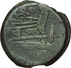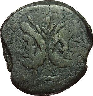 Roman Republican. Terentius Varo. As, ca 169-158. Obv.: Laureate head of Janus; above mark of value I. Rev.: Prow right; above VARO and before mark of value. Below, ROMA. B. Terentia 4. Syd. 364. Cr. 185/1. AE. g. 27.82 mm. 30.00 F+. Repubblica Romana. Terentius Varo. Asse, ca 169-158. D/ Testa di Giano laureata, sopra segno di valore I. R/ Prua a destra; sopra VARO, davanti segno di valore I. Sotto, ROMA. B. Terentia 4. Syd. 364. Cr. 185/1. AE. g. 27.82 mm. 30.00 MB+.