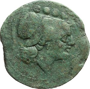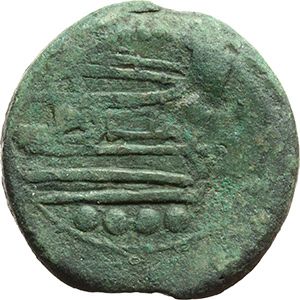Roman Republican. Triens, ca 215-212. Obv.: Helmeted head of Minerva right; above, four pellets. Rev.: Prow right; above, ROMA. Below, four pellets. Syd 105. Cr. 41/7b. AE. g. 20.76 mm. 31.50 About VF. Repubblica Romana. Triente, ca 215-212. D/ Testa elmata di Minerva a destra. R/ Prua a destra; sopra ROMA. Sotto, quattro globetti. Syd 105. Cr. 41/7b. AE. g. 20.76 mm. 31.50 qBB.