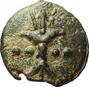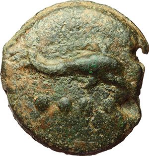 Roman Republican. Triens, ca 240. Obv.: Thunderbolt; two pellets at each side. Rev.: Dolphin right; above sickle and below four pellets. T.V. 38. Cr. 25/6. HN Italy 302. AE. g. 109.00 VF. Repubblica Romana. Serie librale. Triente, ca 240. D/ Fulmine; ai lati quattro globetti. R/ Delfino a destra; sopra falce, sotto quattro globetti. T.V. 38. Cr. 25/6. HN Italy 302. AE. g. 109.00 BB.