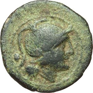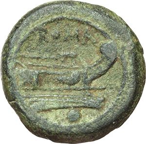 Roman Republican. Uncia, after 211. Obv.: Head of Roma wearing Attic helmet right. Rev.: Prow right, above ROMA, below pellet. Syd. 143e. Cr. 56/7. AE. g. 4.81 mm. 17.50 About VF/VF. Repubblica Romana. Oncia, ca dopo il 211. D/ Testa di Roma con elmo attico a destra. R/ Prua a destra; sopra ROMA, sotto un globetto. Syd. 143e. Cr. 56/7. AE. g. 4.81 mm. 17.50 qBB/BB.