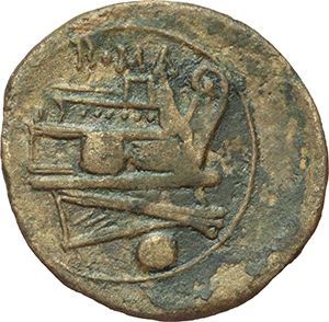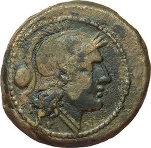 Roman Republican. Uncia, ca 215-212. Obv.: Head of Roma right, wearing Attic helmet; behind pellet. Rev.: Prow right; above ROMA, below pellet. Syd. 108. Cr. 41/10. AE. g. 9.39 mm. 22.30 Good VF. Nice brown patina. Repubblica Romana. Oncia, ca 215-212. D/ Testa di Roma con elmo attico a destra; dietro, un globetto. R/ Prua a destra; sopra ROMA, sotto un globetto. Syd. 108. Cr. 41/10. AE. g. 9.39 mm. 22.30 BB+. Bella patina marrone.