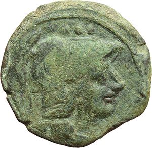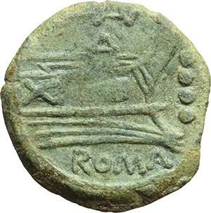 Roman Republican. Valerius. Triens, ca 169-158. Obv.: Helmeted head of Minerva right, behind four pellets. Rev.: Prow right; above VAL, before four pellets. Below, ROMA. B. Valeria 3. Syd. 356b. Cr. 191/3. AE. g. 6.56 mm. 22.00 RR. Good VF. Repubblica Romana. Valerius. Triente, ca 169-158. D/ Testa di Minerva elmata a destra, dietro quattro globetti. R/ Prua a destra; sopra VAL, davanti quattro globetti. Sotto, ROMA. B. Valeria 3. Syd. 356b. Cr. 191/3. AE. g. 6.56 mm. 22.00 RR. BB+.