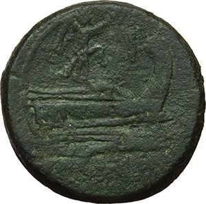 Roman Republican. 'Victory' series. As, Central Italy circa 211-208,. Obv.: Laureate head of Janus; above, mark of value I. Rev.: Prow right; above, Victory with wreath and mark of value. Below, ROMA. Syd. 148. Cr. 61/2. AE. mm. 38.50 About VF. Repubblica Romana. Serie 'Vittoria'. Asse, Italia centrale ca 209-208. D/ Testa laureata di Giano, sopra segno di valore I. R/ Prua a destra; sopra Vittoria con corona e segno di valore. Sotto, ROMA. Syd. 148. Cr. 61/2. AE. mm. 38.50 qBB.