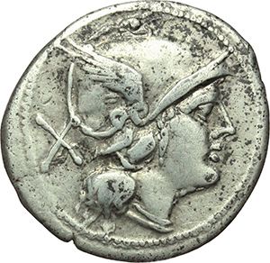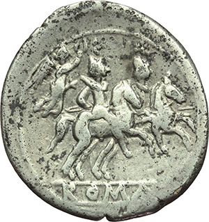 Roman Republican. 'Victory' series. Denarius, Central Italy ca 211-208. Obv.: Helmeted head of Roma right; behind XVI. Rev.: The Dioscuri galloping right; behind, Victory with wreath. In exergue, ROMA. Syd. 147. Cr. 61/1. AG. g. 4.00 mm. 19.50 R. VF/Good FV. Repubblica Romana. Serie 'Vittoria'. Denario, Italia centrale ca 211-208. D/ Testa elmata di Roma a destra; dietro XVI. R/ I Dioscuri al galoppo a destra;dietro una Vittoria con corona. In esergo, ROMA. Syd. 147. Cr. 61/1. AG. g. 4.00 mm. 19.50 R. BB/BB+.