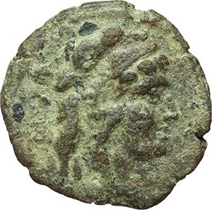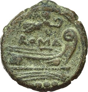 Roman Republican. 'Victory' series. Quadrans, 'light series'. Central Italy ca 211-208. Obv.: Head of Hercules right, wearing lion skin, behind three pellets. Rev.: Prow right; above Victory with wreath and ROMA. Below, four pellets. Syd 148c. Cr. 61/5. AE. g. 7.54 mm. 21.50 NC. About VF. Repubblica Romana. Serie 'Vittoria'. Quadrante, 'serie leggera'. Italia centrale ca 211-208. D/ Testa di Ercole a destra con pelle di leone, dietro tre globetti. R/ Prua a destra; sopra Vittoria con corona e ROMA. Sotto, quattro globetti. Syd 148c. Cr. 61/5. AE. g. 7.54 mm. 21.50 NC. qBB.