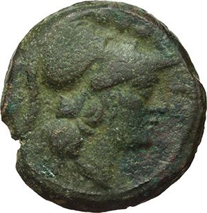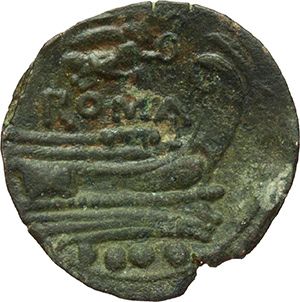 Roman Republican. 'Victory' series. Triens, 'light series'. Central Italy ca 211-208. Obv.: Helmeted head of Minerva right, above four pellets. Rev.: Prow right; above Victory with wreath and ROMA. Below, four pellets. Syd. 148b. Cr. 61/4. AE. g. 9.21 mm. 23.50 NC. Good VF. Repubblica Romana. Serie 'Vittoria'. Triente,'serie leggera'. Italia centrale ca 211-208. D/ Testa di Minerva elmata a destra, sopra quattro globetti. R/ Prua a destra; sopra Vittoria con corona e ROMA. Sotto, quattro globetti. Syd. 148b. Cr. 61/4. AE. g. 9.21 mm. 23.50 NC. BB+.