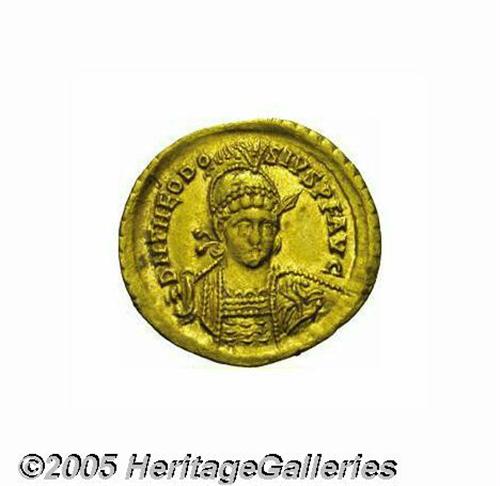 <B>Theodosius II.</B></I> A.D. 402-450. AV solidus (21 mm, 4.43 g). Constantinople, A.D 425-429. Helmeted and cuirassed bust facing slightly right, holding spear over shoulder and shield with horseman motif / Theodosius II and Valentinian III seated facin