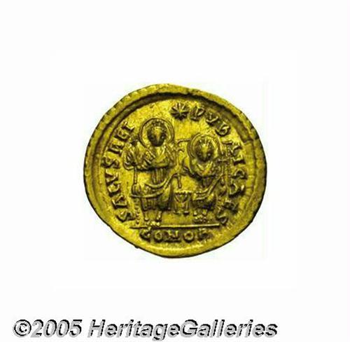 <B>Theodosius II.</B></I> A.D. 402-450. AV solidus (21 mm, 4.43 g). Constantinople, A.D 425-429. Helmeted and cuirassed bust facing slightly right, holding spear over shoulder and shield with horseman motif / Theodosius II and Valentinian III seated facin