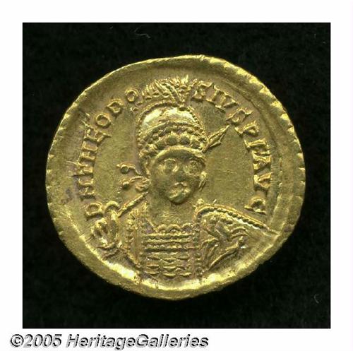 <B>Theodosius II.</B></I> A.D. 402-450. AV solidus (21 mm, 4.43 g). Constantinople, A.D 425-429. Helmeted and cuirassed bust facing slightly right, holding spear over shoulder and shield with horseman motif / Theodosius II and Valentinian III seated facin