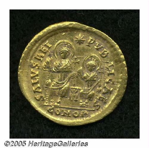 <B>Theodosius II.</B></I> A.D. 402-450. AV solidus (21 mm, 4.43 g). Constantinople, A.D 425-429. Helmeted and cuirassed bust facing slightly right, holding spear over shoulder and shield with horseman motif / Theodosius II and Valentinian III seated facin