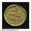 <B>Theodosius II.</B></I> A.D. 402-450. AV solidus (21 mm, 4.43 g). Constantinople, A.D 425-429. Helmeted and cuirassed bust facing slightly right, holding spear over shoulder and shield with horseman motif / Theodosius II and Valentinian III seated facin