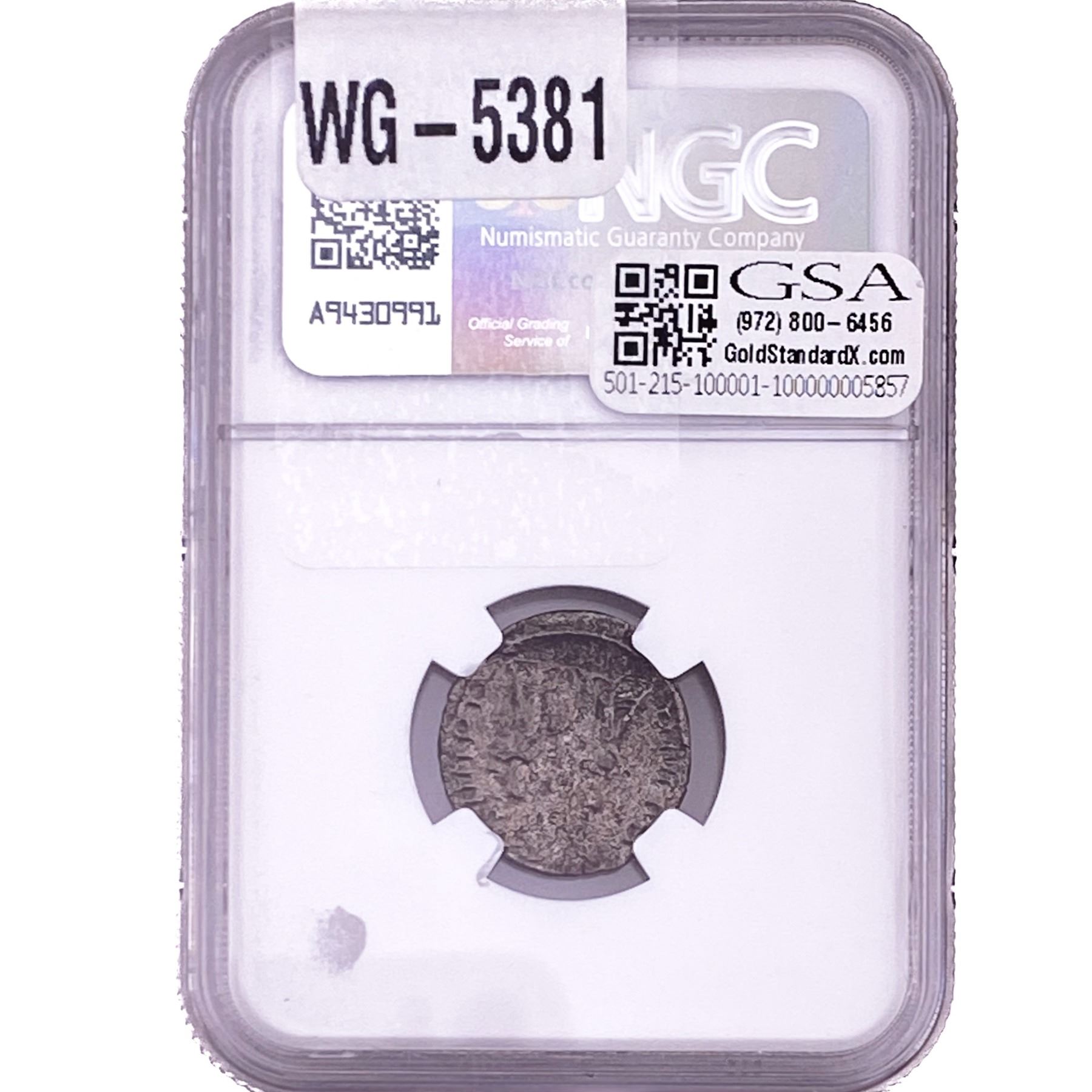 e. Coins sold referencing a third-party grading service are sold “AS IS” without any express or implied warranty, except for a guarantee by GSA that they are genuine. Removal or alteration of the holder, voids all of Bidder’s claims concerning that Product. Certain warranties may be available from the grading services and Bidders are referred to them for further details: Numismatic Guaranty Corporation (NGC), PO Box 4776, Sarasota, FL 34230, www.ngccoin.com/services/writtenguarantee.asp; Professional Coin Grading Services (PCGS), PO Box 9458, Newport Beach, CA 92658, www.pcgs.com/guarantee.html; ANACS, 6555 S. Kenton St., Ste. 303, Englewood, CO 80111; and Independent Coin Grading Co. (ICG), 7901 East Bellview, Ave., Suite 50, Englewood, CO 80111.
