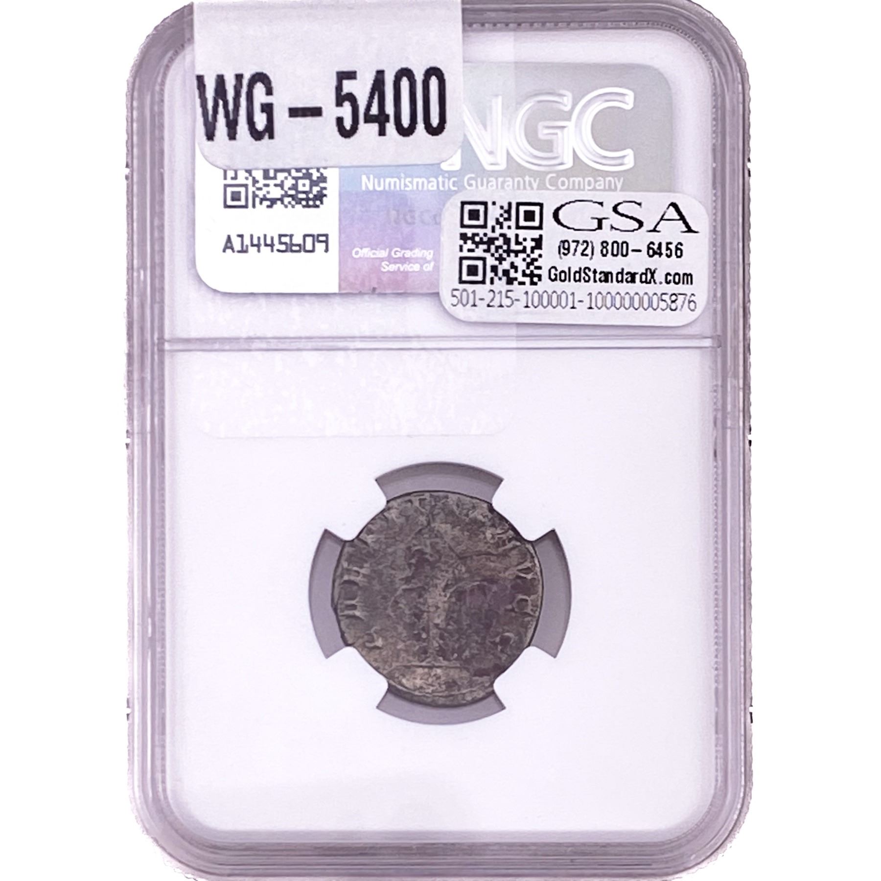 e. Coins sold referencing a third-party grading service are sold “AS IS” without any express or implied warranty, except for a guarantee by GSA that they are genuine. Removal or alteration of the holder, voids all of Bidder’s claims concerning that Product. Certain warranties may be available from the grading services and Bidders are referred to them for further details: Numismatic Guaranty Corporation (NGC), PO Box 4776, Sarasota, FL 34230, www.ngccoin.com/services/writtenguarantee.asp; Professional Coin Grading Services (PCGS), PO Box 9458, Newport Beach, CA 92658, www.pcgs.com/guarantee.html; ANACS, 6555 S. Kenton St., Ste. 303, Englewood, CO 80111; and Independent Coin Grading Co. (ICG), 7901 East Bellview, Ave., Suite 50, Englewood, CO 80111.