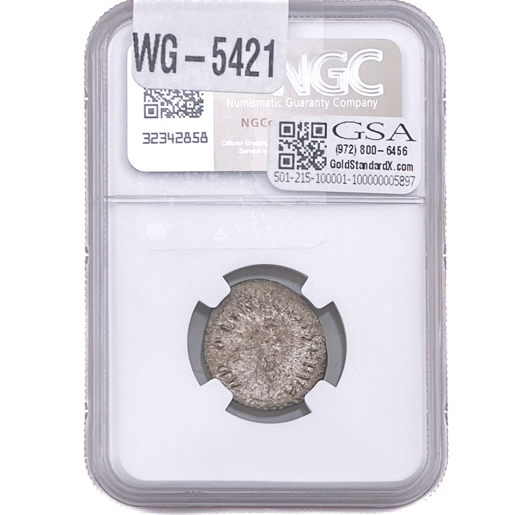 e. Coins sold referencing a third-party grading service are sold “AS IS” without any express or implied warranty, except for a guarantee by GSA that they are genuine. Removal or alteration of the holder, voids all of Bidder’s claims concerning that Product. Certain warranties may be available from the grading services and Bidders are referred to them for further details: Numismatic Guaranty Corporation (NGC), PO Box 4776, Sarasota, FL 34230, www.ngccoin.com/services/writtenguarantee.asp; Professional Coin Grading Services (PCGS), PO Box 9458, Newport Beach, CA 92658, www.pcgs.com/guarantee.html; ANACS, 6555 S. Kenton St., Ste. 303, Englewood, CO 80111; and Independent Coin Grading Co. (ICG), 7901 East Bellview, Ave., Suite 50, Englewood, CO 80111.