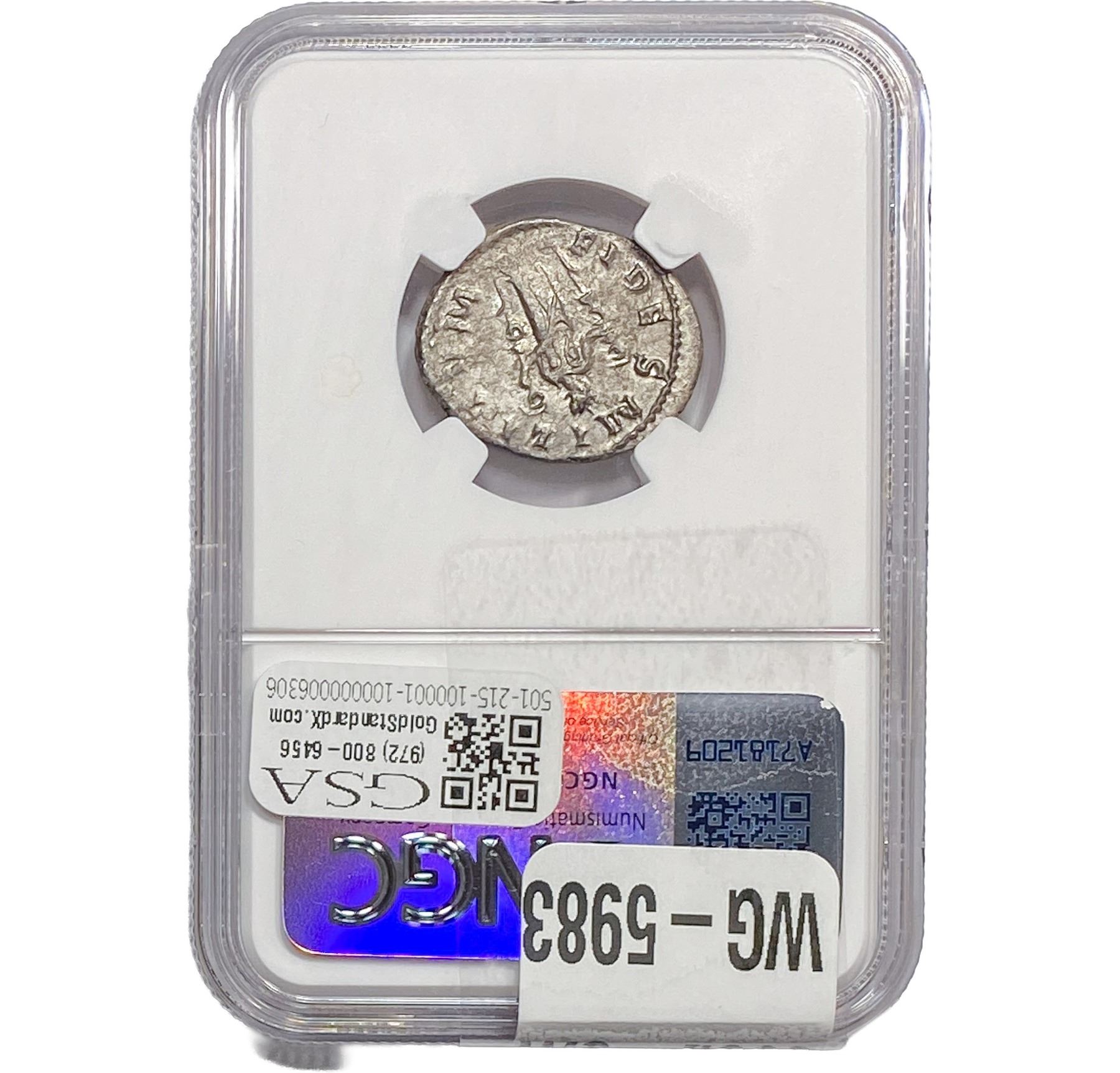 e. Coins sold referencing a third-party grading service are sold “AS IS” without any express or implied warranty, except for a guarantee by GSA that they are genuine. Removal or alteration of the holder, voids all of Bidder’s claims concerning that Product. Certain warranties may be available from the grading services and Bidders are referred to them for further details: Numismatic Guaranty Corporation (NGC), PO Box 4776, Sarasota, FL 34230, www.ngccoin.com/services/writtenguarantee.asp; Professional Coin Grading Services (PCGS), PO Box 9458, Newport Beach, CA 92658, www.pcgs.com/guarantee.html; ANACS, 6555 S. Kenton St., Ste. 303, Englewood, CO 80111; and Independent Coin Grading Co. (ICG), 7901 East Bellview, Ave., Suite 50, Englewood, CO 80111.