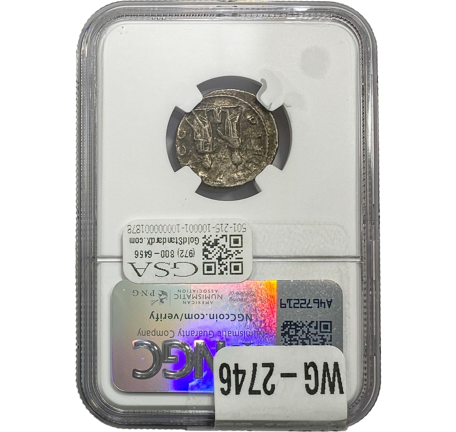 e. Coins sold referencing a third-party grading service are sold “AS IS” without any express or implied warranty, except for a guarantee by GSA that they are genuine. Removal or alteration of the holder, voids all of Bidder’s claims concerning that Product. Certain warranties may be available from the grading services and Bidders are referred to them for further details: Numismatic Guaranty Corporation (NGC), PO Box 4776, Sarasota, FL 34230, www.ngccoin.com/services/writtenguarantee.asp; Professional Coin Grading Services (PCGS), PO Box 9458, Newport Beach, CA 92658, www.pcgs.com/guarantee.html; ANACS, 6555 S. Kenton St., Ste. 303, Englewood, CO 80111; and Independent Coin Grading Co. (ICG), 7901 East Bellview, Ave., Suite 50, Englewood, CO 80111.