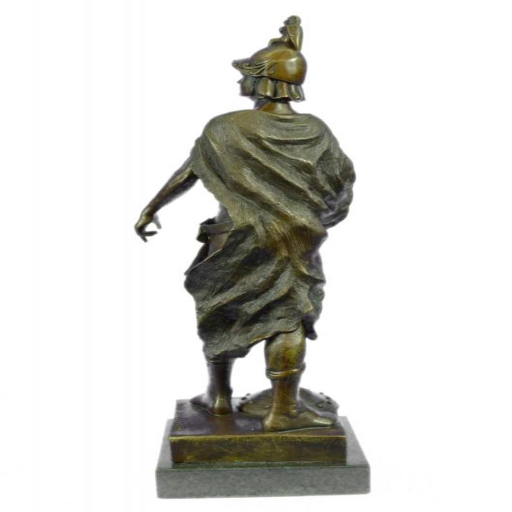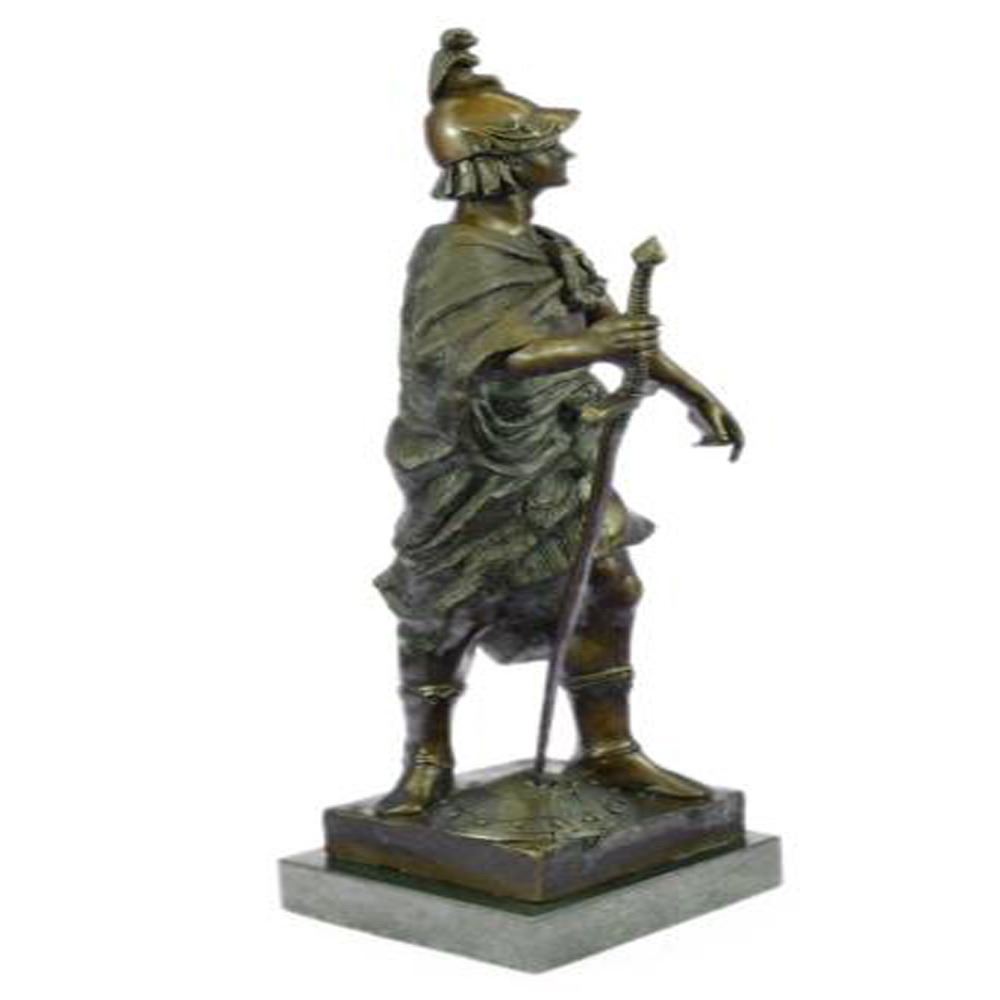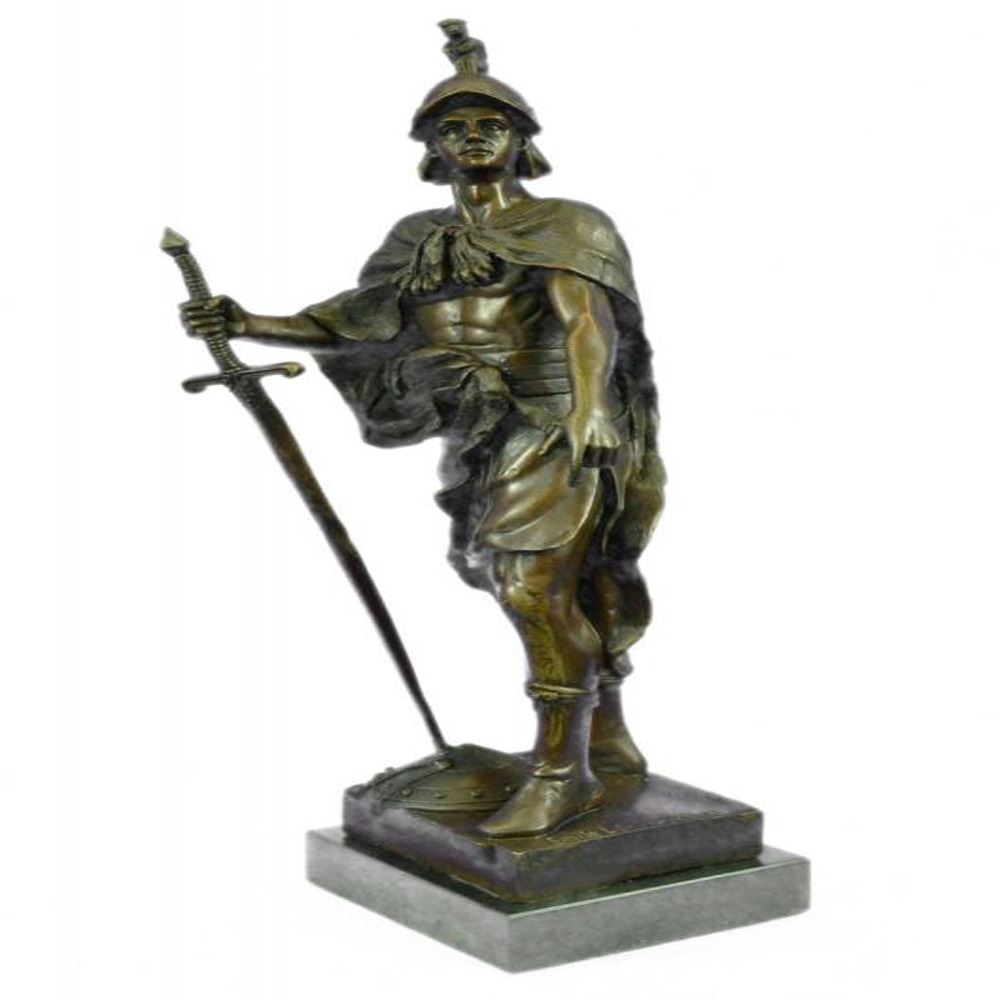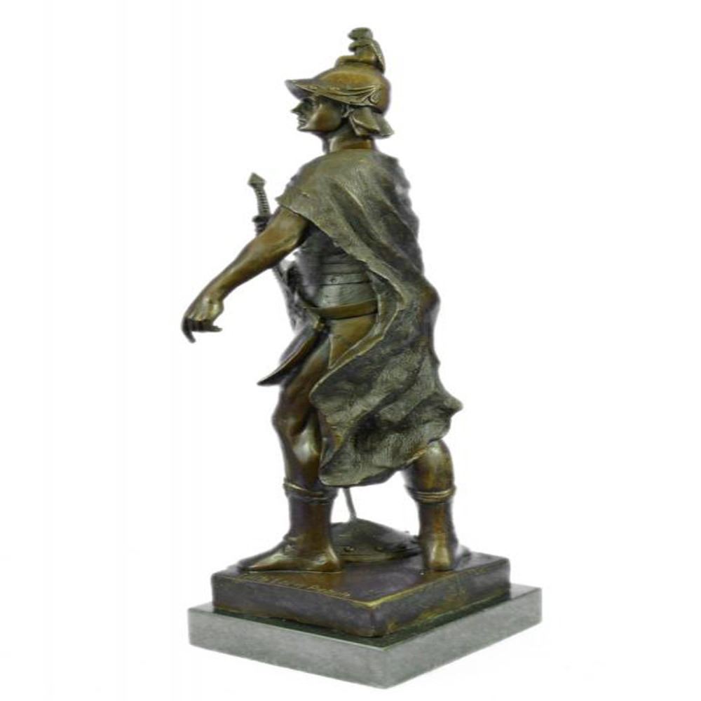 A Bronze Figure of a Warrior Le Devoir, the helmeted figure standing over a fallen shield, This magnificent Sculpture was cast using the archaic method of lost wax casting and stained with a brown patina finish for preservation. The Sculpture is mounted upon a marble base. Bronze Dimensions with Marble Base: Height 18 X Width 7 inches. Weight: 12 LBS.