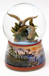 Roman Waterglobe - Wild Geese - Perfect Father's Day gift! Glass waterglobe with detailed waterfowl scene inside and nature scene painting around porcelain base. Measures 3.75" x 3.75" x 6".