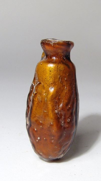 A choice Roman amber mold-blown glass date flask, c. 1st Century AD, with short flaring neck and inward folded rim, the body very well formed with good color, the interior with opaque white glass lining. H: 2 5/8 in (6.6 cm). Cf. Constable-Maxwell no. 73 for an identical example. Ex Donald Brown Collection, Boston, Massachusetts, formed in the 1960s.