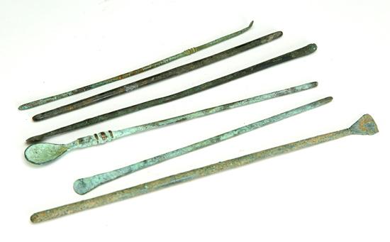 Roman bronze beauty instruments. Circa 2nd century AD. Sometimes referred to as "medical" instruments, these were probably used for mixing beauty potions. Group of 6, each measuring approximately 6-7".