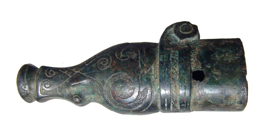 A Roman bronze decorative element in the form of a elephant or pig head, c. 1st - 3rd Century AD, in lovely style the animal's head adorned with incised swirls and loops, raised bands behind and a decorative loop at the top, the snout or trunk ending in a knob. A most attractive and interesting piece which may have served as a lance or spear handle or perhaps a shaft for a wood or leather scabbard. L: 3 3/4 in (9.6cm). For a discussion of finials such as this see: Grenville L. Winthrop, Fogg Art Museum, Cambridge, Ma. Exhibition Catalog of 1969, pp. 46-7; Ex Lord McAlpine collection.