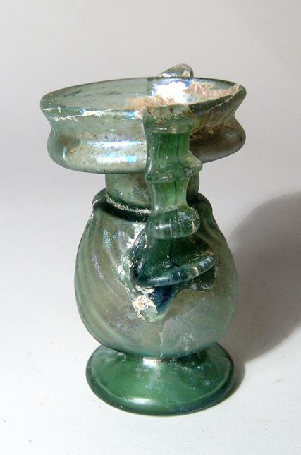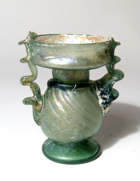 An attractive Roman green glass two-handled flask, c. 5th Century AD, the rim collared with short vertical neck, the ovoid body with raised vertical swirls and raised base with wide, flat foot with deeply concaved interior, The two handles each in the same color as the vessel and with four pinched horizontal ridges. A handsome vessel with constricted opening in neck for dispensing precious oils and perfume. H: 3 in (7.6 cm). Intact with good color and light iridescence. Ex Donald Brown Collection, Boston, Massachusetts, formed in the 1960s