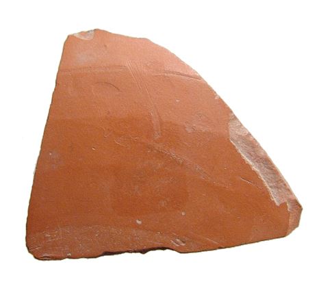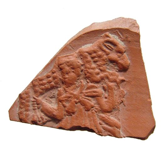 A published Roman red-ware fragment with Jesus as the Good Shepherd, North Africa, c. 5th Century AD, - John 10 - This fragment depicts Jesus as the good shepherd. Jesus is rather elaborately dressed with a ram around his shoulders. - Light from the Age of Augustine no.38 p. 50 (this piece). This fragment belonged to Cornelius C. Vermeule who was the curator of the Boston Museum of Fine Arts. This piece has also been published in Light from the Age of Augustine by John J. Herrmann Jr. and Annewies Van Den Hoek. Ex Santa Barbara County collection.