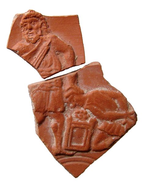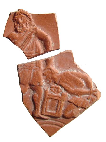 A pair of Roman red-ware sherds with Abraham sacrificing Isaac, North Africa, c. 5th Century AD, from- Genesis 22 - 'Abraham is bearded and wears a workingman's short tunic with one shoulder uncovered (an exomis). He wields a double-edged sword with studded pommel. On hearing the angel's command…he turns his head upward, while he still holds Isaac's head over the altar with his left hand…Isaac, wearing a short tunic and with his hands tied behind his back, is bent over an altar. The hand of his father holds down the boys head preparatory to delivering a fatal stroke with his sword' Augustine used this story to share God's provision and deliverance. (Light from the Age of Augustine p. 34-35). Ref: Solomonson 1969 Abb 76 pp. 23-29; 58; Light from the Age of Augustine pp. 34-35. Nos. 22-23. Ex Santa Barbara County collection.