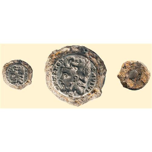 Roman silver plaquette with a gryllos motif. Late 3rd-early 4th century AD. Dia. 12 mm. Once mounted on top of an iron object, perhaps a support for a seal or a ring, which has since deteriorated, the circular silver plaquette depicts a marvelous intaglio rendition of a gryllos, composed of a bearded male head whose moustache develops into a bird, a theater mask, an eagle and the head of a lion; CONSTAN-T-I VIVES - "Live In Constancy" around the gryllos. Grylloi were fanciful puzzle-like designs which consisted of several individual heads joined into one. By looking at the design from different directions the viewer could isolate each head. The portrait of the man and the style of the lettering are closely comparable to coin emissions of the Tetrarachy and suggest that the intaglio work was executed by a die engraver. For a good introductory passage on grylloi, together with examples on intaglios bearing such images see Richter, Gems, p. 114, nos. 541 ff.