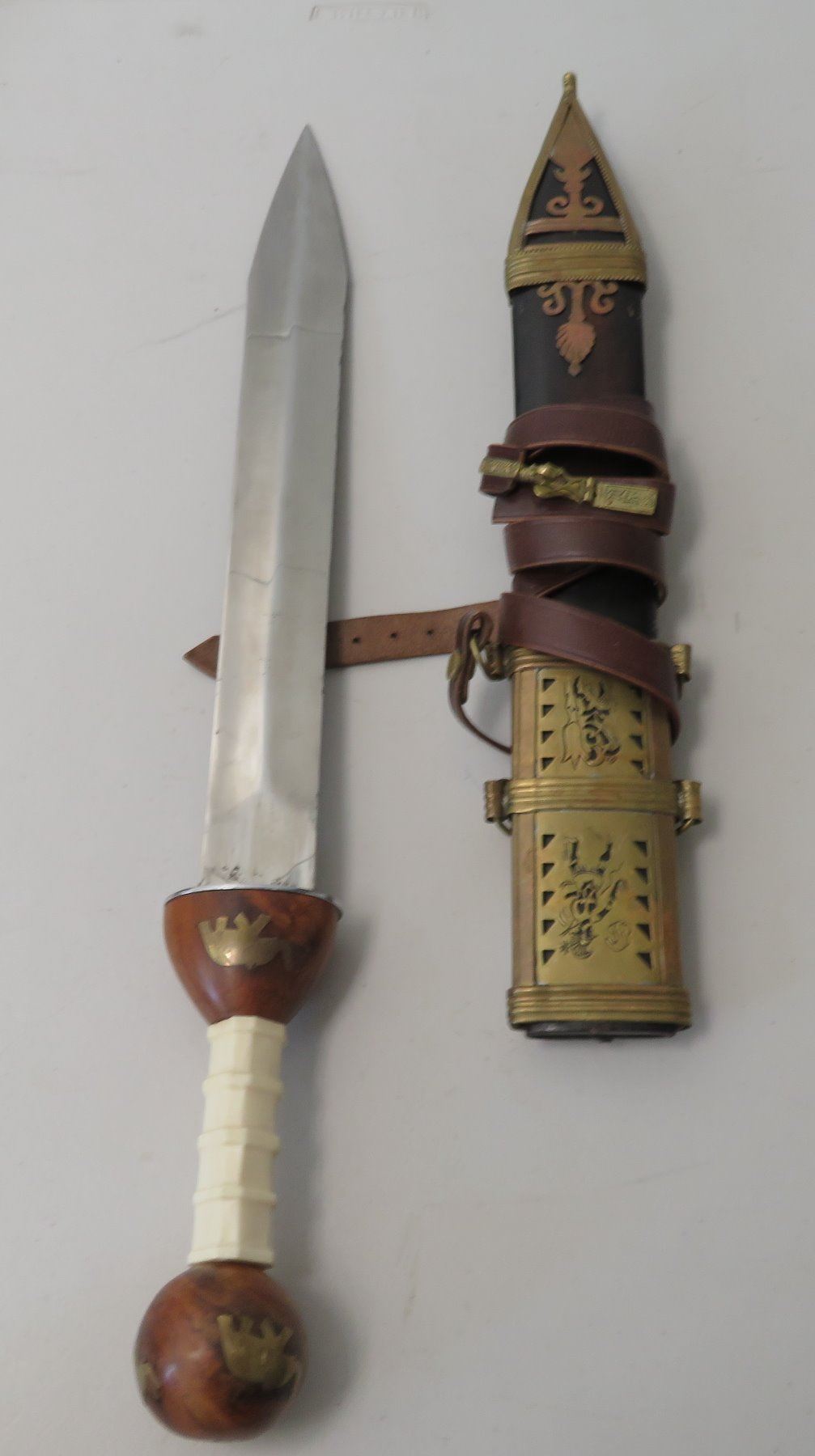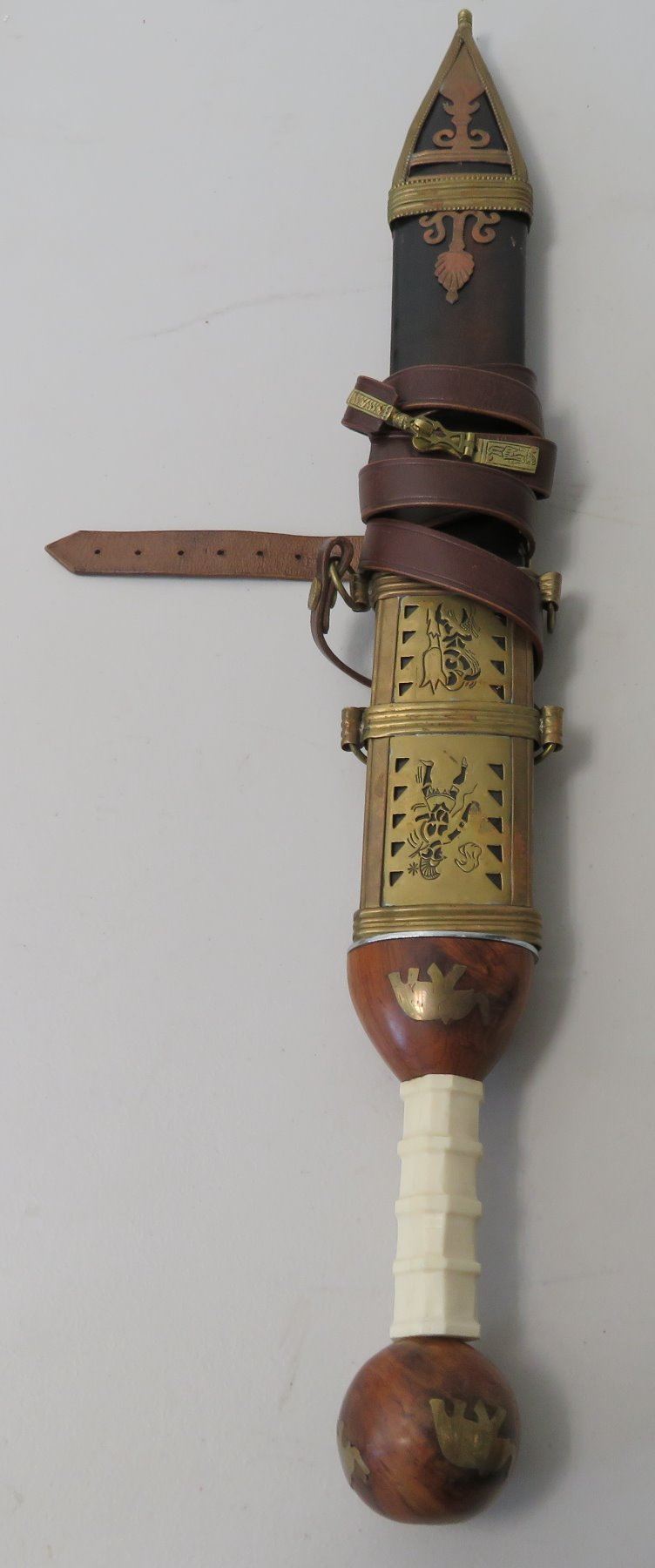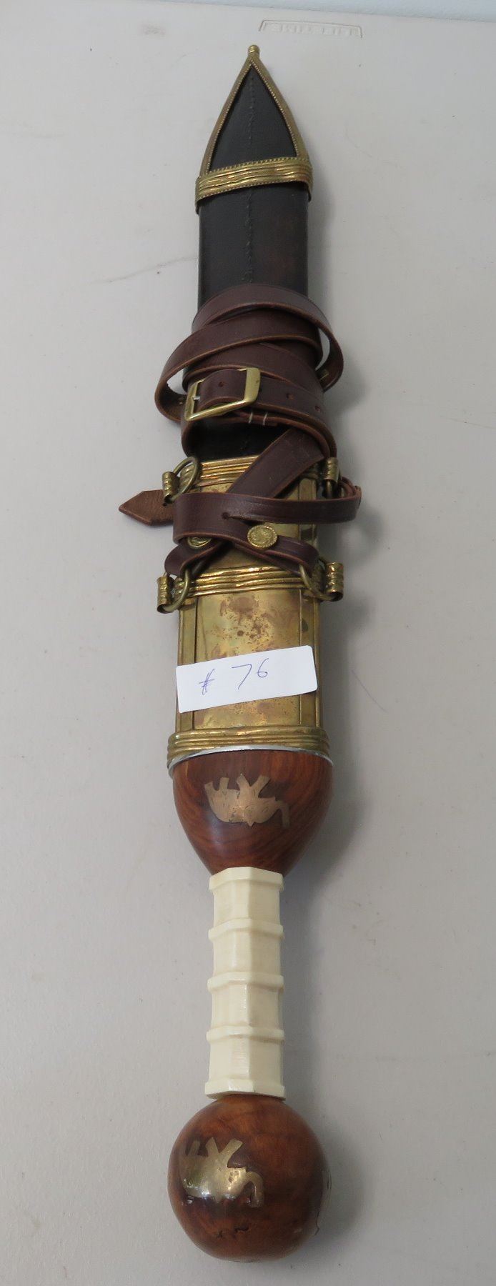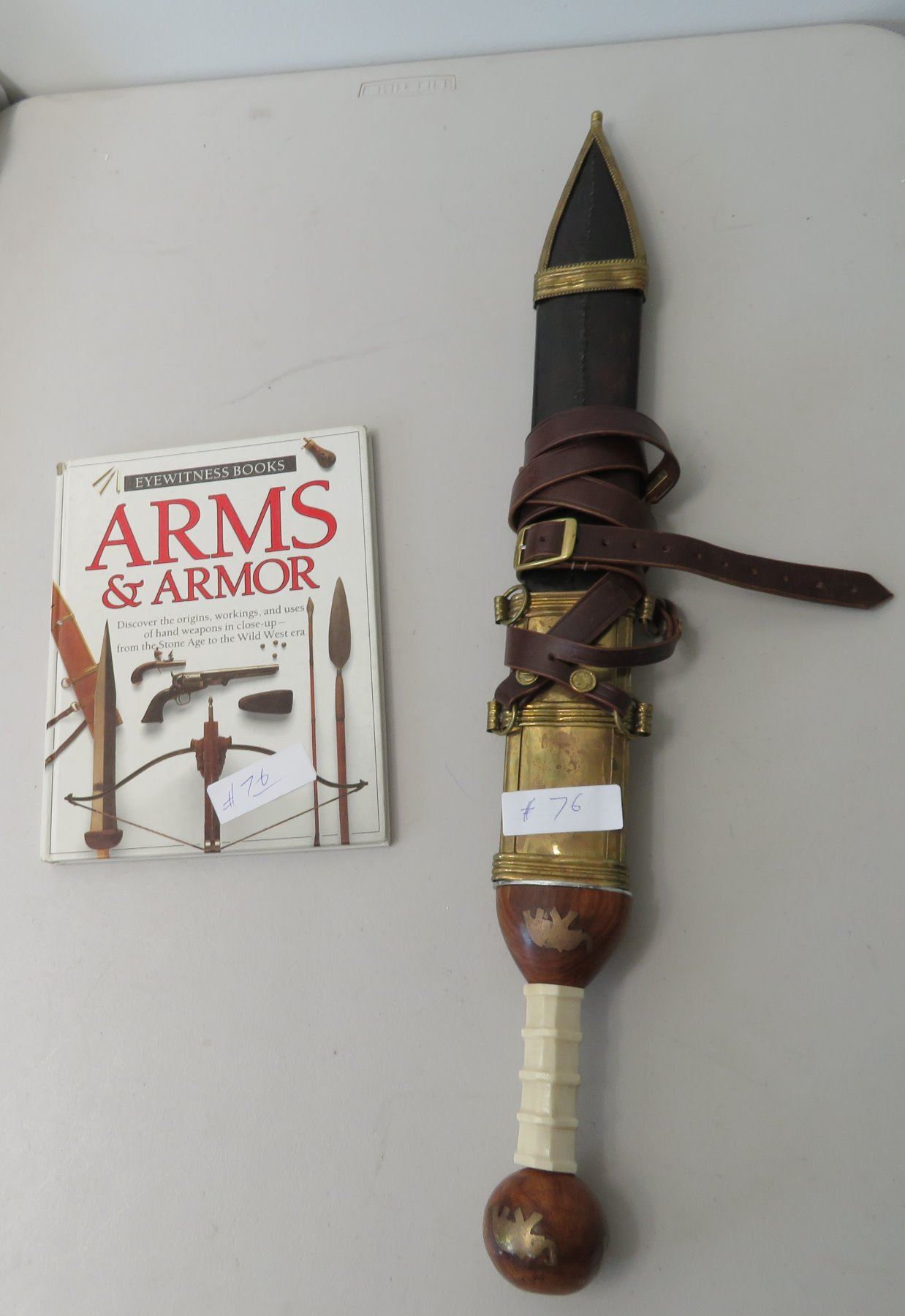 Roman-style Sword, modern item. Made of leather, wood, bone, brass and steel, the item measures 30" x 3". Middle East. Also includes book. Condition: Good, see images. Shipping: $55.00 w/insurance and signature, due to length and weight.