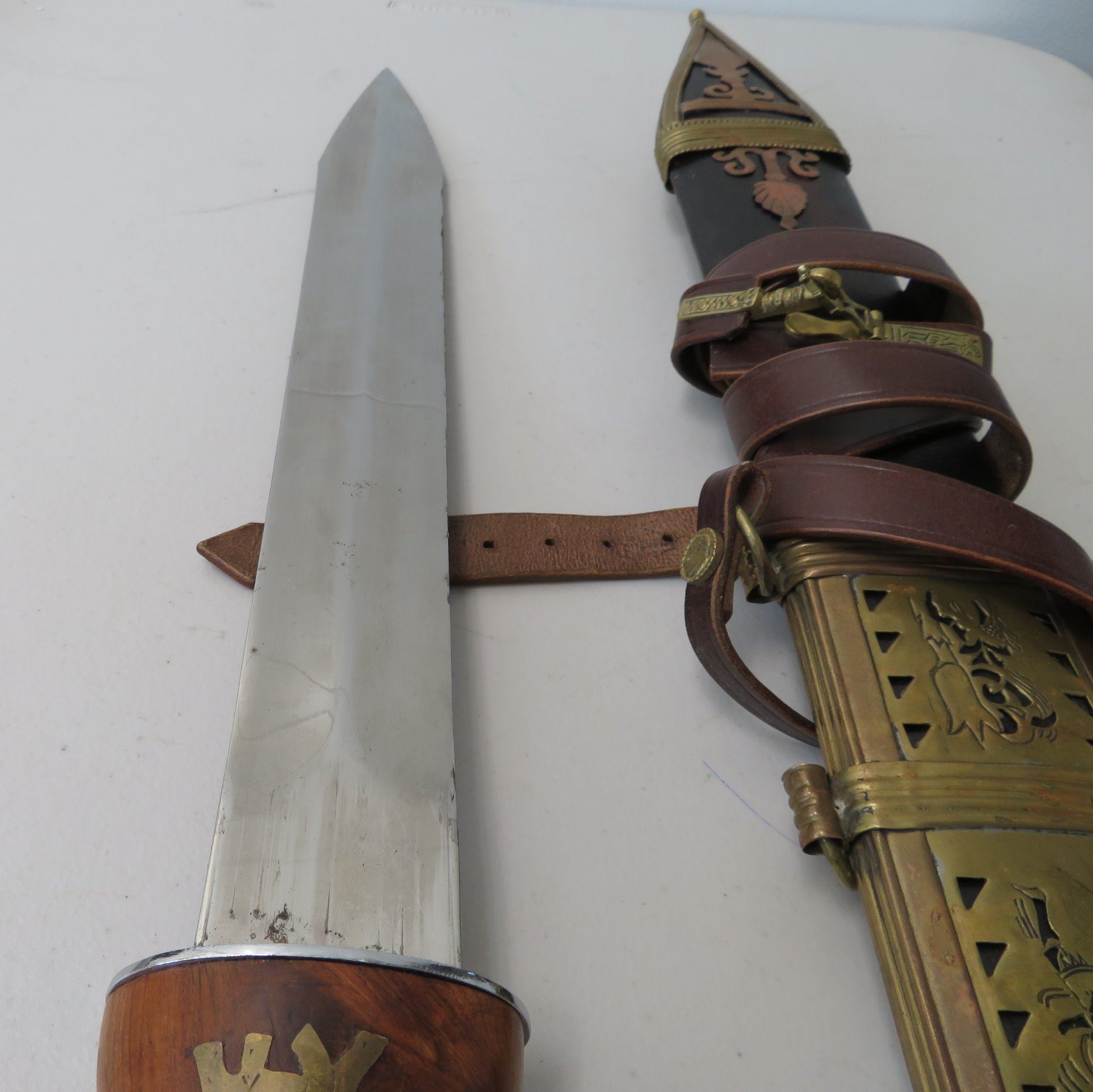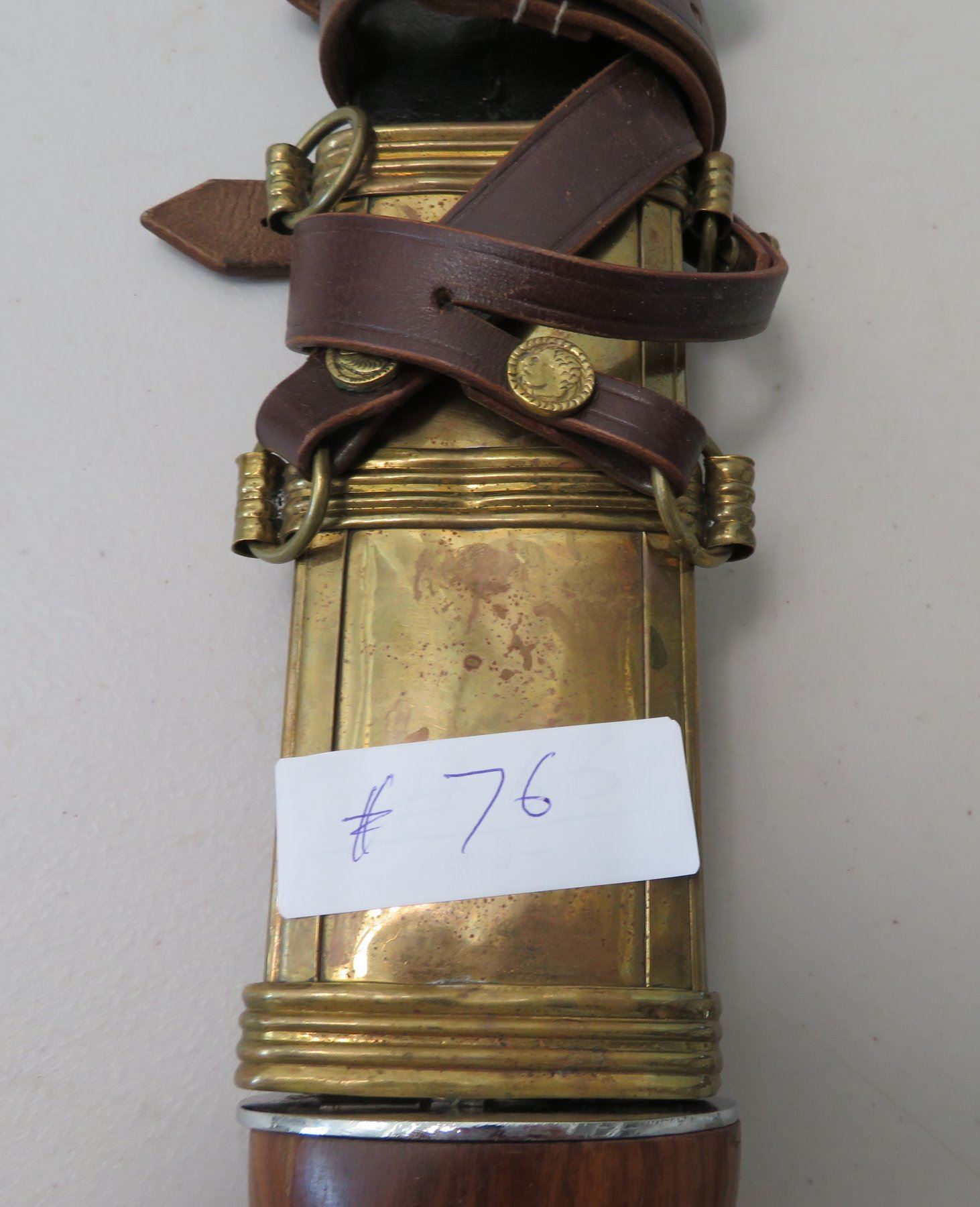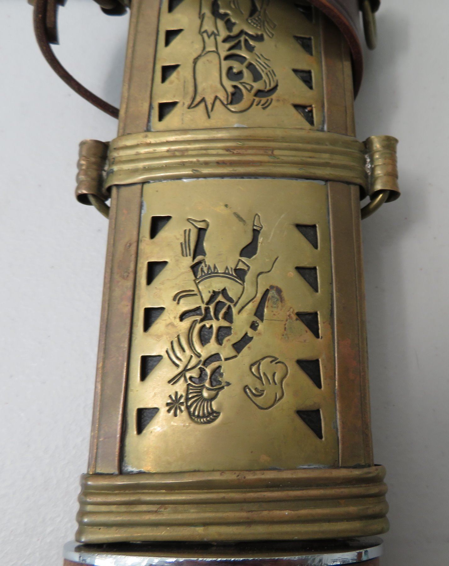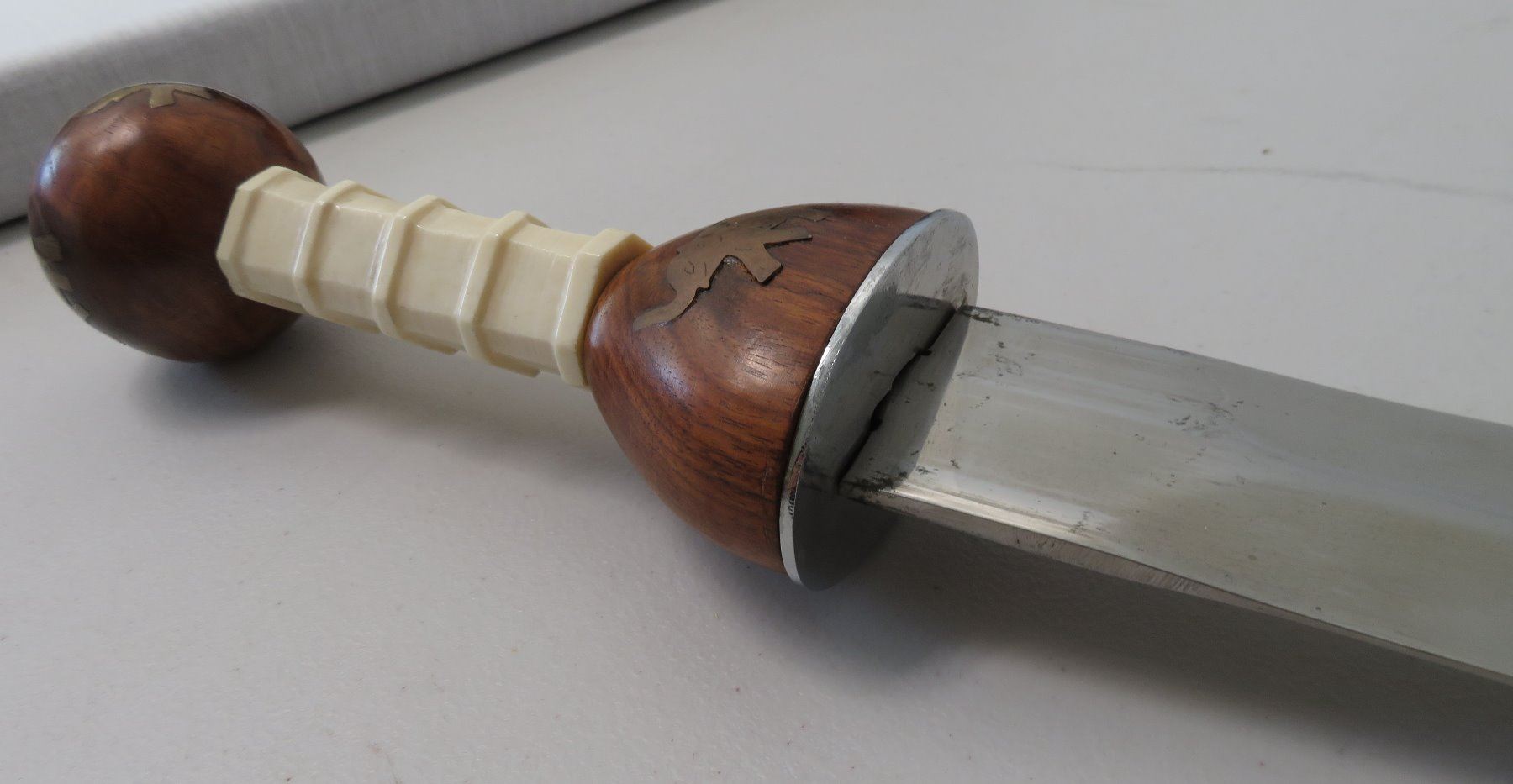 Roman-style Sword, modern item. Made of leather, wood, bone, brass and steel, the item measures 30" x 3". Middle East. Also includes book. Condition: Good, see images. Shipping: $55.00 w/insurance and signature, due to length and weight.
