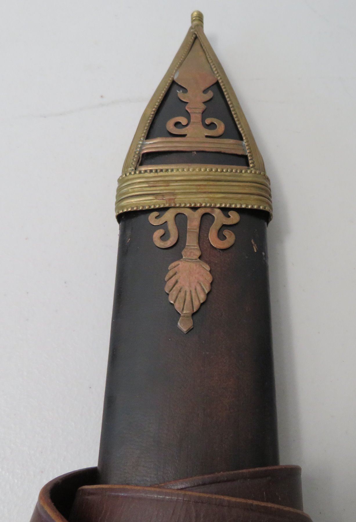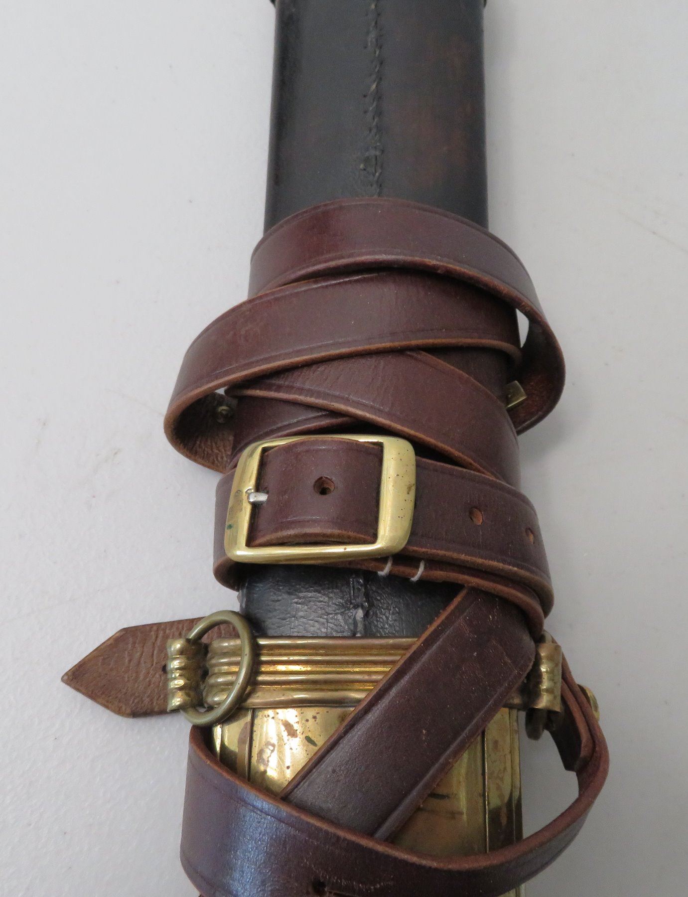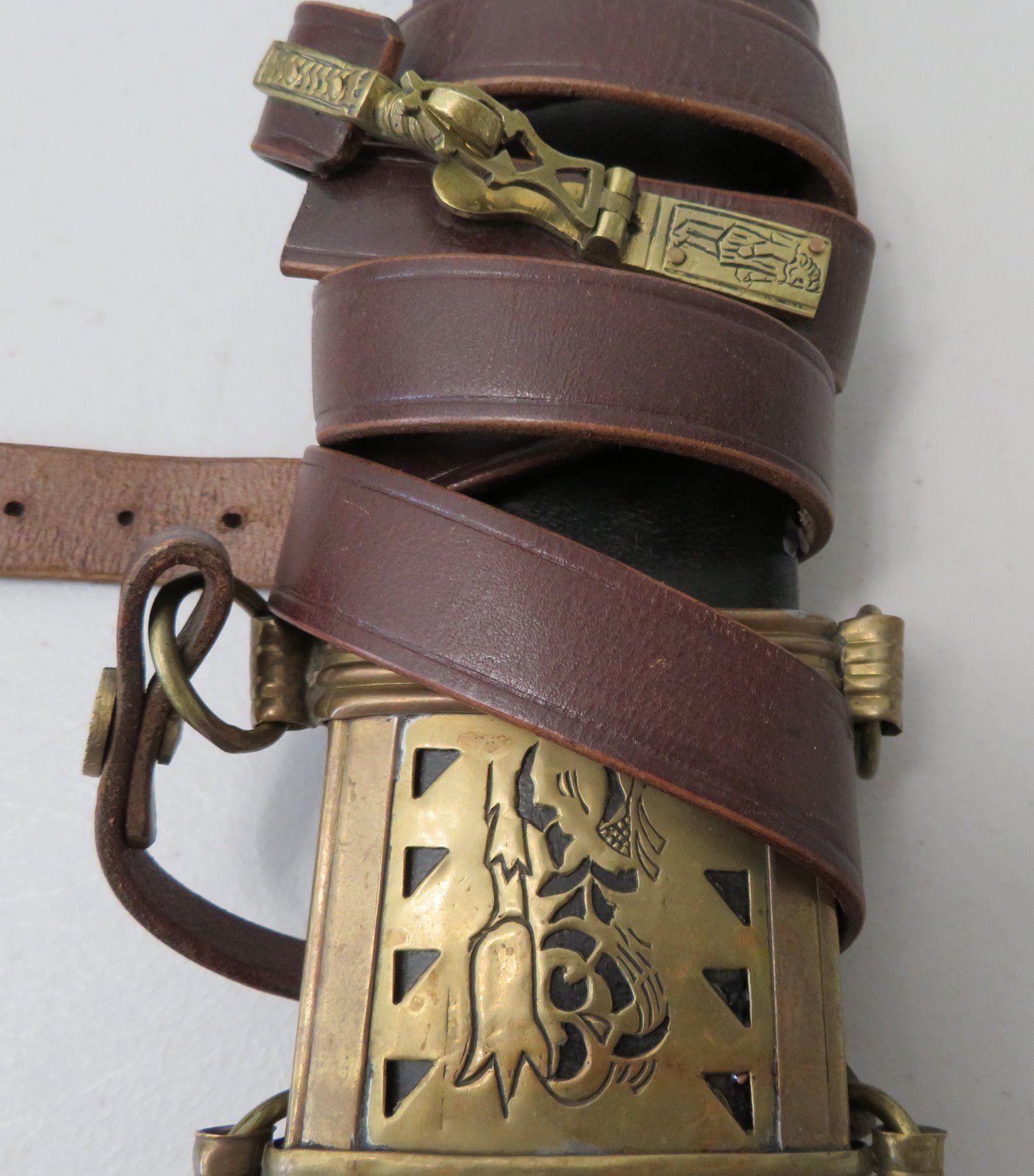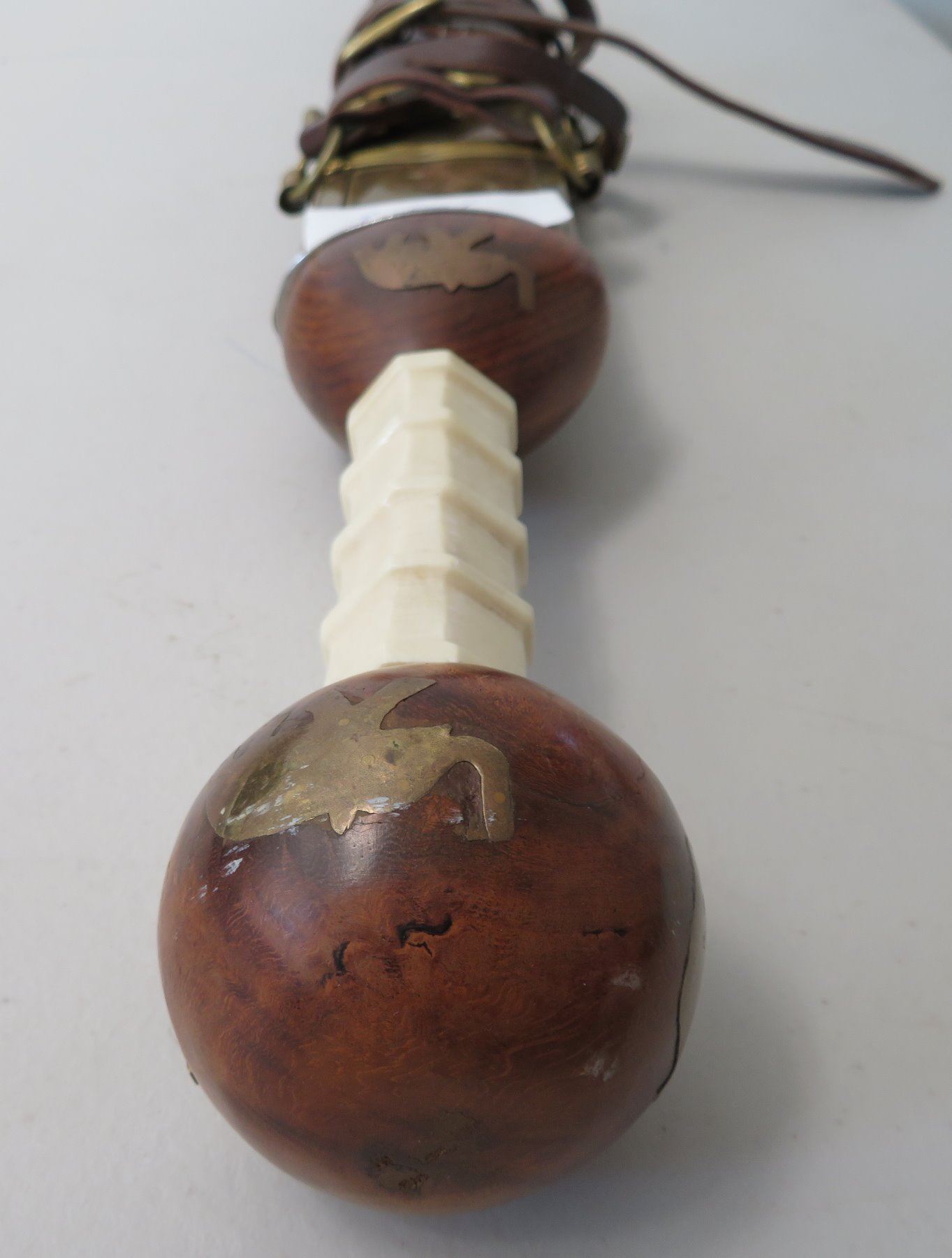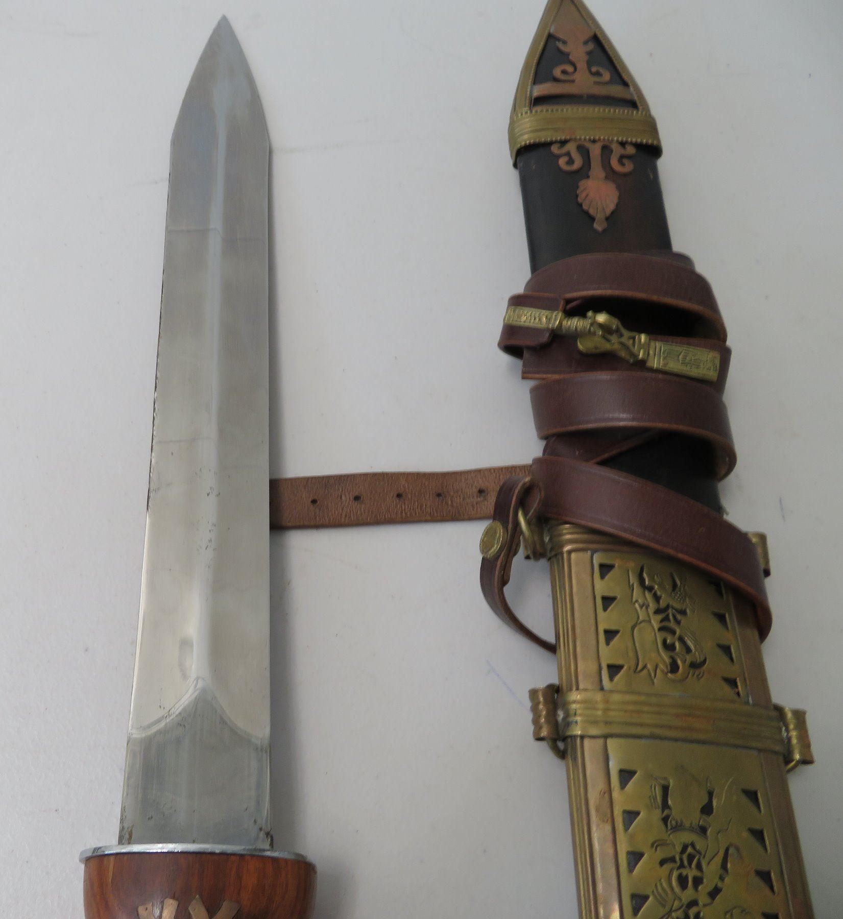 Roman-style Sword, modern item. Made of leather, wood, bone, brass and steel, the item measures 30" x 3". Middle East. Also includes book. Condition: Good, see images. Shipping: $55.00 w/insurance and signature, due to length and weight.