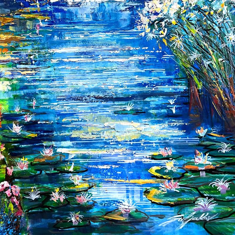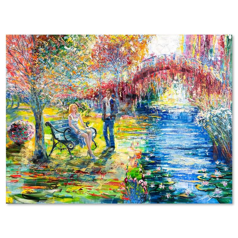 "Romance at Lily Pond" is an original oil painting on stretched canvas by Vadik Suljakov, hand signed by the artist. Includes Letter of Authenticity. Measures approx. 40" x 30" (image).
