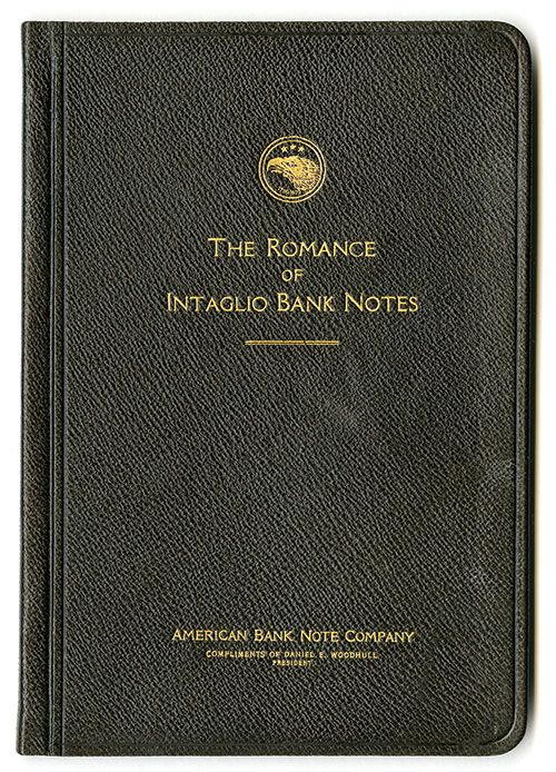 New York, 1925, “The Romance of Intaglio Bank Notes “, Title in gold stamping on dark brown hard cover, By Louis L. Coudert, VF -XF condition. Interior has intaglio printed vignette of Paul Revere. The bottom has “Compliments of Daniel E. Woodhull, President (ABNC). Literally as printed 90 years ago.