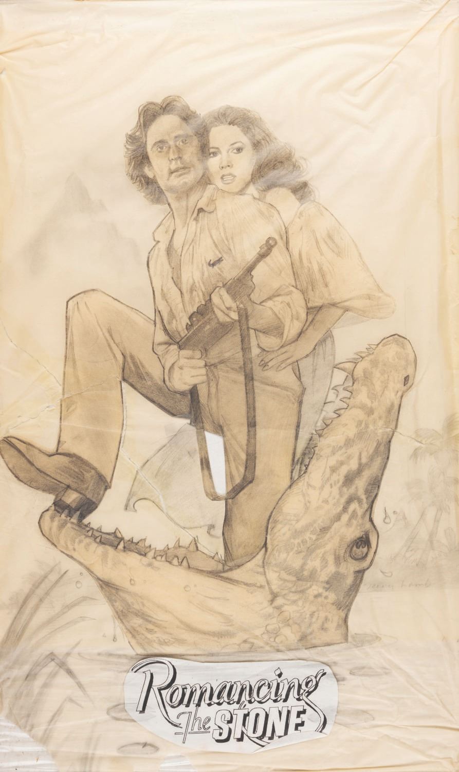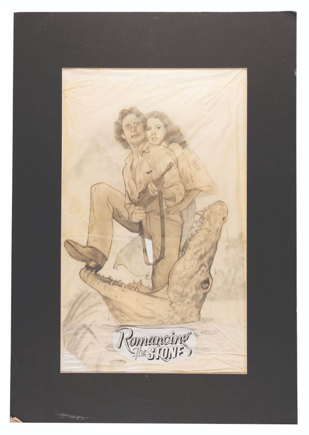 (20th Century Fox, 1984) An original poster concept for the Michael Douglas-Kathleen Turner film "Romancing the Stone.” This early concept showcases the film's charismatic leads in a crocodile's mouth, unlike the final poster where the duo is depicted swinging on a vine. Accomplished in graphite on vellum, with a visible image of 13” x 21.5” on a 20” x 29” matte, the concept is in fair condition with heavy tears, tape repairs, creases, wear to the matte, and a 0.75” x 2” area of vellum missing at the center.