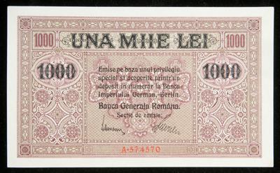 Romania. 1000 Lei, ND (1917). Similar to P-M8. German Occupation -WW I. Banca Generala Romana. Woman left and Mercury right. Uncirculated.