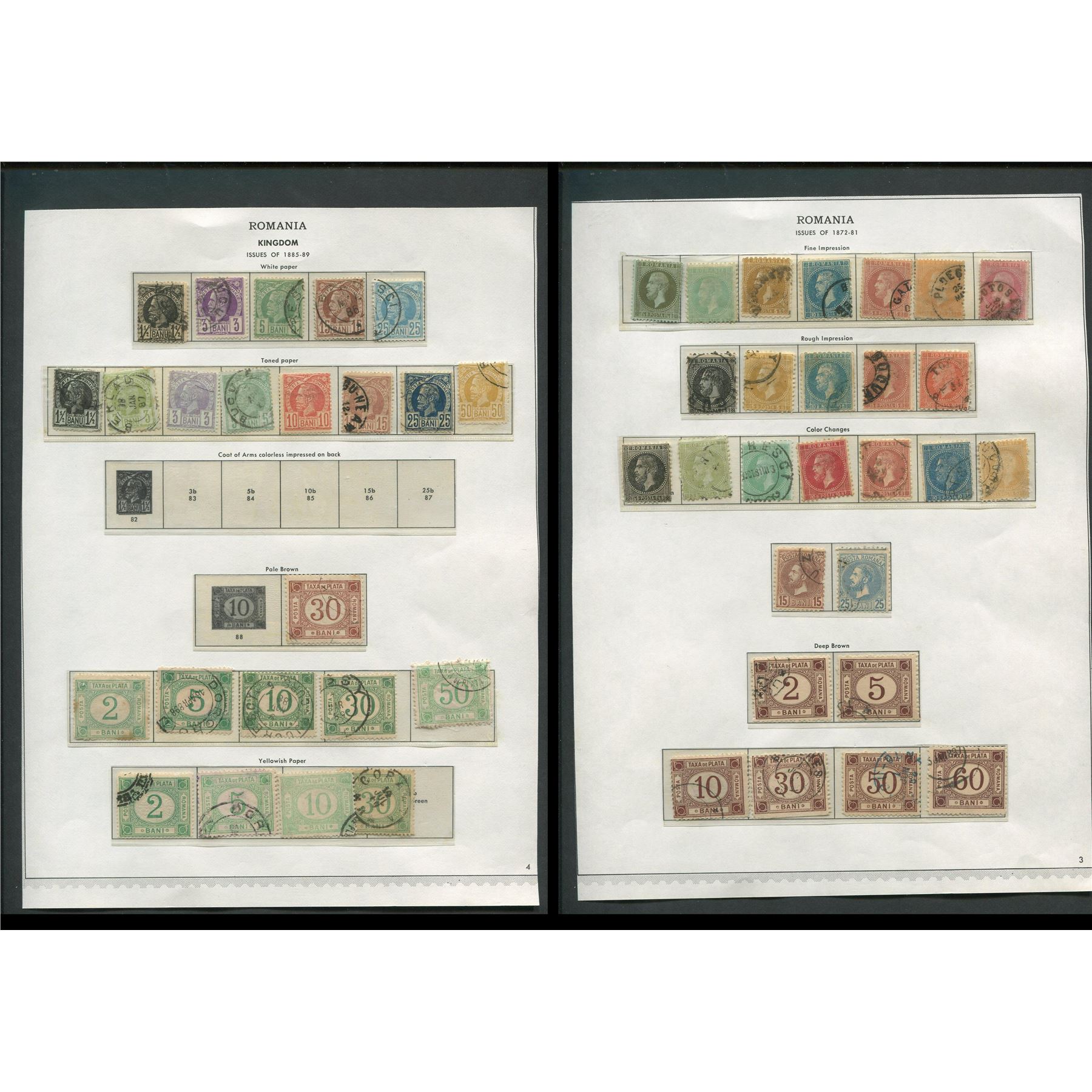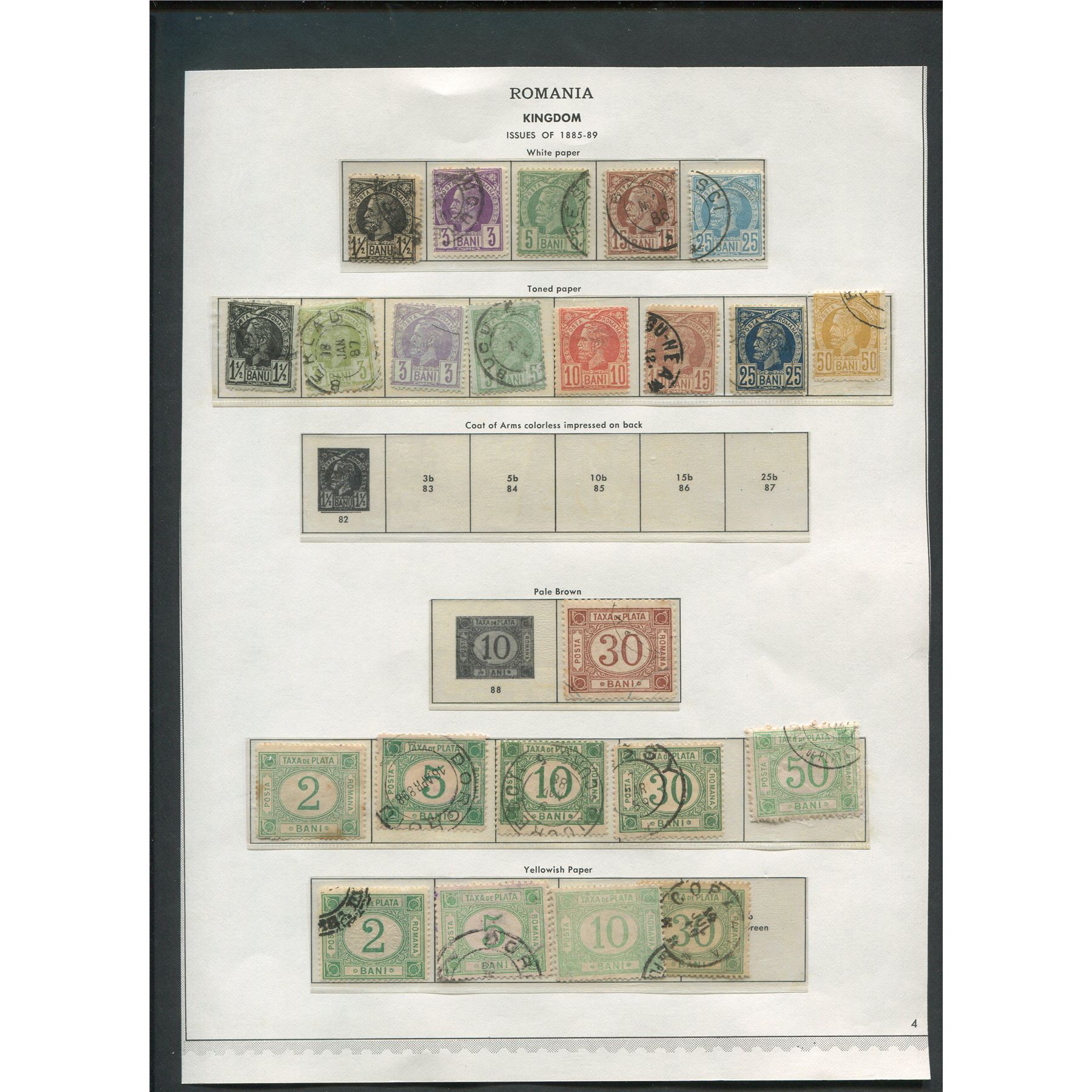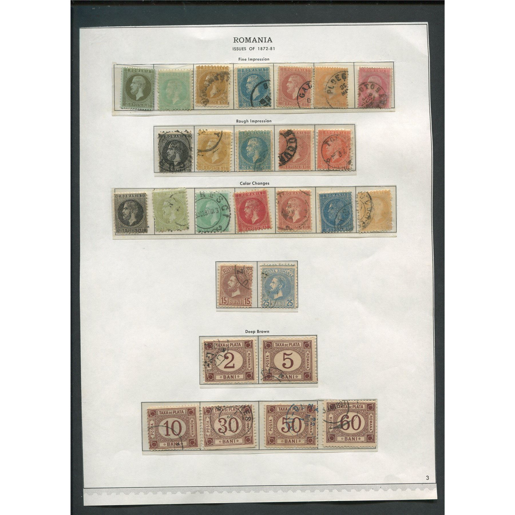 Romania 1885 to 1889 stamp collection. This collection contains 51 stamps. Included are 1- 1872 "Fine Impression" 1 1/2b #53, 1- 1872 "Fine Impression" 3b #54, 1876 "Rough Impression" #60 to #65 (S/C value = $76.75), "Colour Changes" S/C value = $130), 1- 1872 10b ultra #a10 (S/C value $52), 1- 1872 50b blue red #a10 (S/C value = $240), 1881 #J1 to #J6 (S/C value = $13.75), 1885-1889: #75 to #87 (S/C value = $53), 9- Postage Due 30b yellow green (S/C value = $20).
