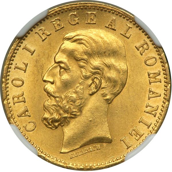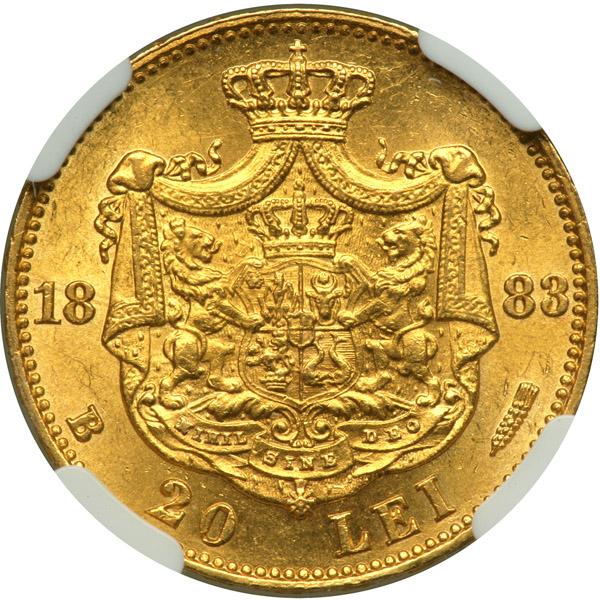 Romania. 20 Lei, 1883. Fr-3; KM-20. Weight 0.1867 ounce. Carol I, 1866-1914. Head left. Reverse: Arms. Nice original mint luster. NGC graded MS-63.