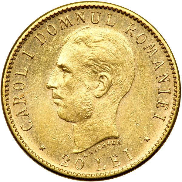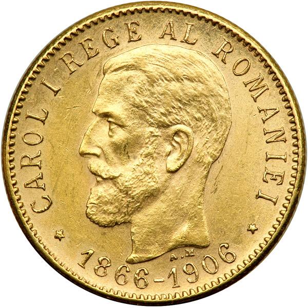 Romania. 20 Lei, 1906. Fr-5; KM-37. Carol I, 1866-1914. Old head. Reverse: Young head. On the 40th year of reign. NGC graded MS-62.