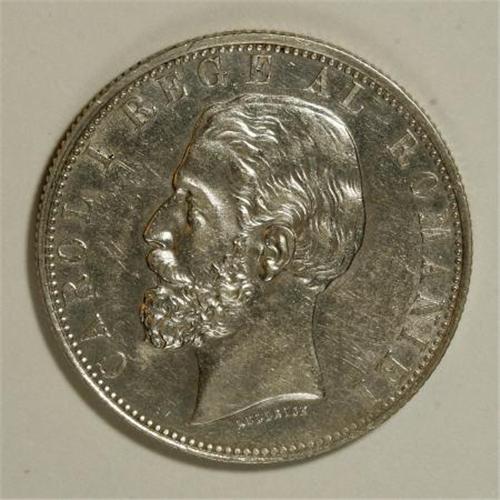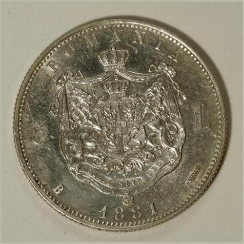 <B>Carol I 5 Lei 1881-B,</B></I> KM16, sharp AU, lightly cleaned but with some original luster, scarce one-year type with REGE in the obverse legend and reeded edge.<BR><BR><b>Shipping:</b> Coins & Currency (<a target="_blank" href="http://www.heritageauctions.com/common/shipping.php">view shipping information</a>)
